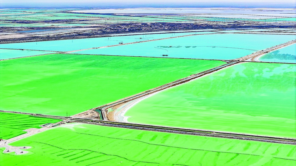 沿著一條鹽粒路,驅車從中心碼頭再往前開,便是鹽湖股份在鹽田基礎上,開發出的察爾汗鹽湖景區。從空中俯瞰,景區仿若一汪綠藍相間的眼淚,出現在荒涼的戈壁中,這般夢幻場景,也讓景區成為備受內地游客追捧的新晉網紅打卡地。不遠處,采鹽船和工廠還在晝夜運行,一邊是生態濕地、一邊是鹵水鹽田,這里,已成為鹽湖股份堅持綠色發展的最好注腳。