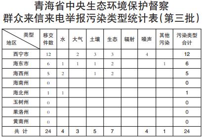 青海新聞網·大美青海客戶端訊 11月25日,中央第五生態環境保護督察組向我省交辦了第三批群眾信訪舉報件,共24件(來電22件,來信2件),涉及我省4個市州,其中西寧市12件、海東市6件、海西蒙古族藏族自治州5件、海北藏族自治州1件。群眾舉報反映問題涉及噪音污染4件、生態破壞7件、大氣污染3件、水污染4件、土壤污染5件、其他污染1件。截至目前,中央第五生態環境保護督察組向我省交辦的第三批群眾信訪舉報件已經移交相關市州和部門,各地和相關部門正在按照程序抓緊辦理。