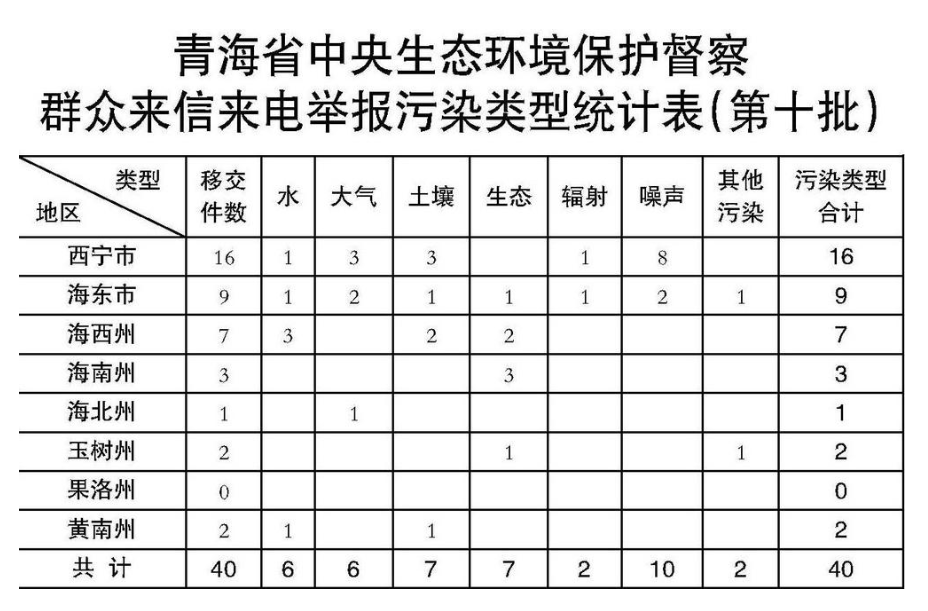 青海新聞網·大美青海客戶端訊 12月2日,中央第五生態環境保護督察組向青海省交辦了第十批群眾信訪舉報件共40件(來電36件,來信4件),涉及全省7個市州,其中西寧市16件、海東市9件、海西蒙古族藏族自治州7件、海南藏族自治州3件、海北藏族自治州1件、玉樹藏族自治州2件、黃南藏族自治州2件。群眾舉報反映問題涉及噪音污染10件、生態破壞7件、大氣污染6件、水污染6件、土壤污染7件、輻射污染2件、其他污染2件。截至目前,中央第五生態環境保護督察組向我省交辦的第十批群眾信訪舉報件已經移交相關市州和部門,各地和相關部門正在按照程序抓緊辦理。