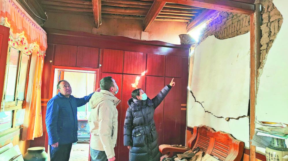 12月19日10時,循化縣災情最為嚴重的清水鄉塔沙坡村,地震導致130號再乃白家七八米長的圍墻倒塌,磚石砂土堵了一半村道,三位佩戴黨員徽章的基層干部,用長木桿推倒剩下的半截搖搖欲墜的圍墻,以防不測。
