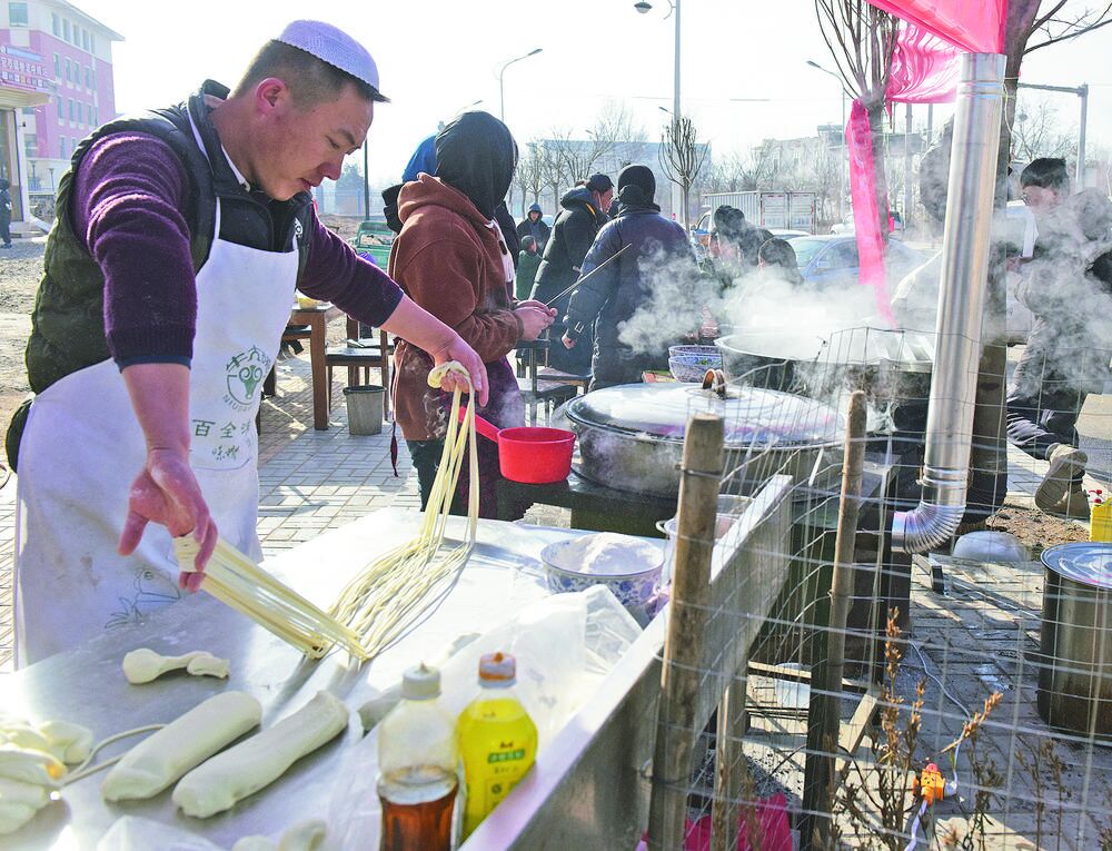 就在普華才讓一家圍坐一起吃早餐時,在海東市民和回族土族自治縣官亭鎮的街道上,馬俊海自發準備的免費拉面店開張了。他將自家店里的廚房操作臺搬到室外空地,在店門口搭起爐灶燒沸了一鍋熱湯,開始煮面。