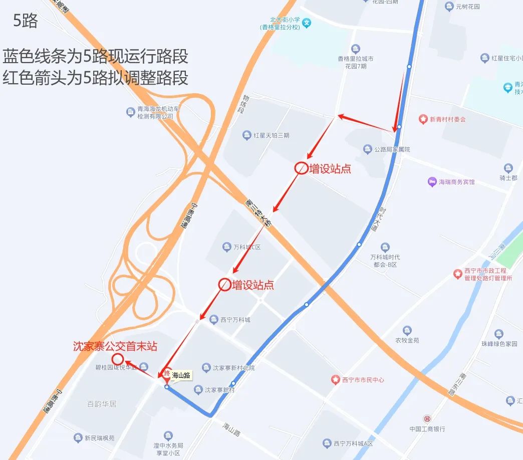 調(diào)整后5路公交車(試運(yùn)行)線路走向:火車站、濱河路、黃河路、五四大街、同仁路、時代大道、安寧路、海山路,沈家寨公交首末站,單程11.5公里。增設(shè)“安寧路北”東西兩側(cè)站、“安寧路南”東西兩側(cè)站、“沈家寨公交首末站”南北兩側(cè)站;取消“春暉路口”東西兩側(cè)站、“市民中心西”東西兩側(cè)站、“沈家寨新村”西側(cè)站、“海山路”北側(cè)站。