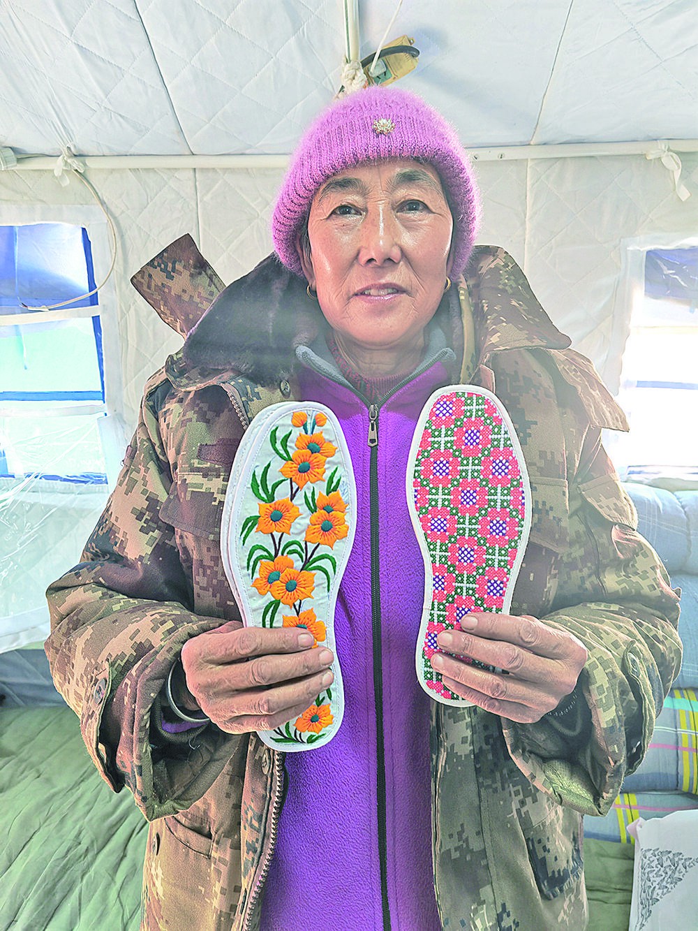 66歲的村民蔣香蘭走進帳篷,把自己繡的鞋墊遞給了村干部。“我腿腳不好,讓老阿爺跑了一趟,拿了大小5雙鞋墊,這是我們家的一點心意。”她說。
