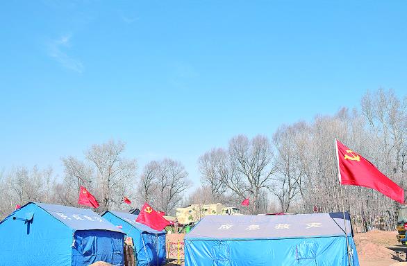 鮮紅的黨旗飄揚在災區(qū)安置點。
