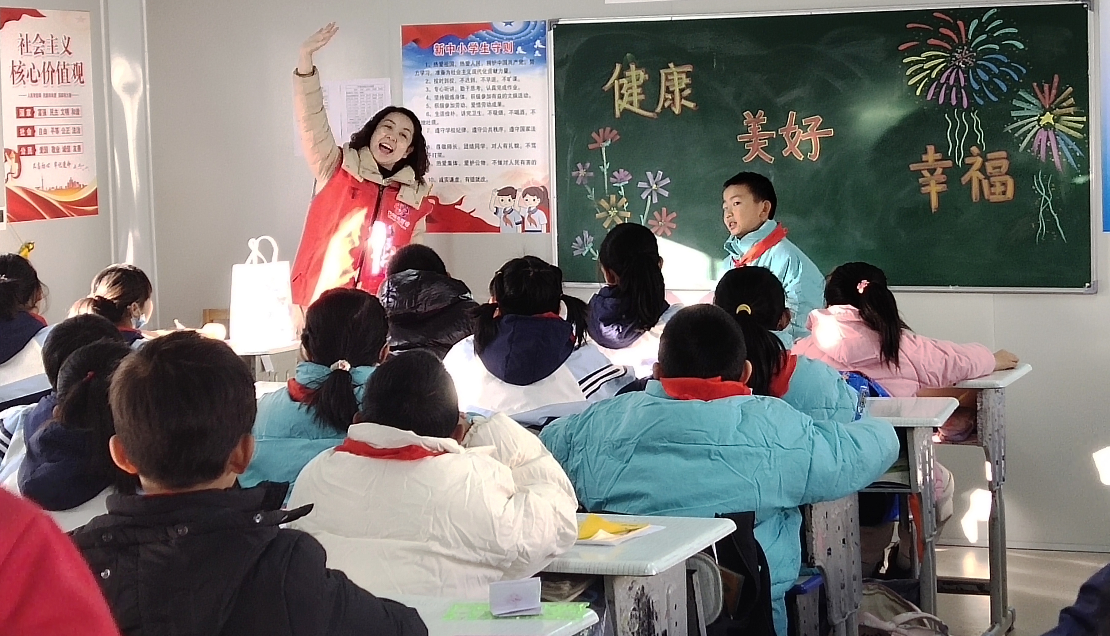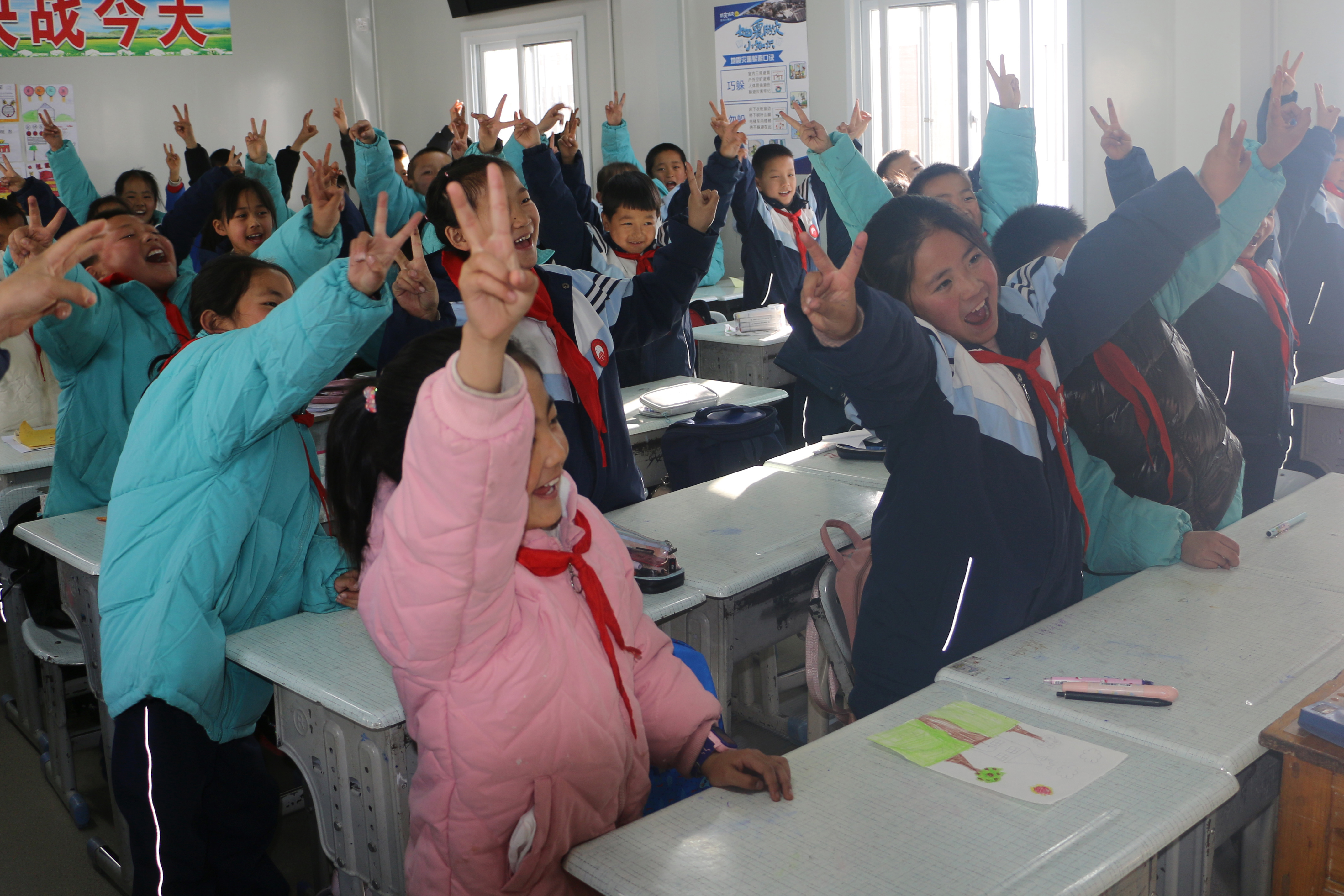 在溫暖如春的民和縣官亭鎮中心小學臨時教室里,巾幗志愿者服務團隊正通過與孩子們互動游戲的方式,化解孩子們的災后恐懼心理。