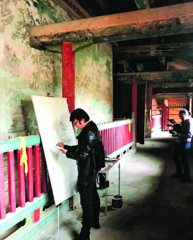 劉觖毅然關(guān)掉自己在北京宋莊200多平方米的工作室,只帶著畫具回到青海,在離瞿曇寺最近的一家農(nóng)舍租了間簡陋的房子,一頭扎進寺院靜心臨摹回廊壁畫。一年中,他別無所求,帶上幾個燒餅、一瓶水,一畫就是一天。回廊為半露天,七八月還好,其他月份,陰冷的穿堂風讓人瑟瑟發(fā)抖、難以忍受。冬日嚴寒,雙腳生疼,手凍得紅腫僵硬無法握筆。但是,他心中那顆執(zhí)著于藝術(shù),保護傳承中國古代優(yōu)秀壁畫,讓后人一睹瞿曇寺壁畫真容的癡心一直在不停地燃燒。