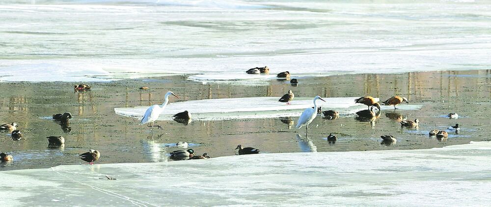 1月4日,許多候鳥(niǎo)在西寧市北川河濕地的冰面和河水中棲息、覓食。目前在這里棲息的有白鷺、赤麻鴨、綠頭鴨等候鳥(niǎo),隨著西寧市生態(tài)環(huán)境的不斷改善,每到冬季,成群候鳥(niǎo)來(lái)到西寧城市周邊的濕地、河畔中越冬。祁國(guó)彪 攝