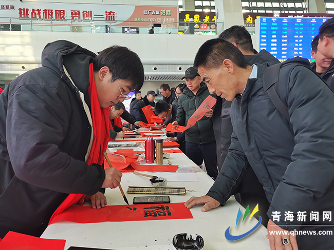 候車室內,出行的旅客攜老帶幼,拎著大包小包,臉上難掩回家的喜悅之情。近日,來自中國鐵路青藏集團有限公司文聯的13名鐵路書法家搭起案臺為旅客寫春聯和“福”字,讓旅客把滿滿的福氣帶回家。車站“天路格;”服務小分隊也同時行動了起來,他們在候車室的人群中穿梭往來,在服務旅客的同時,向候車旅客認真介紹“12306”的服務新功能和車票改簽新規則,并與旅客進行有獎互動問答。小提琴演奏和愛國歌曲演唱等“文藝快閃”表演,更是把春運的氣氛推向了高潮,一時間歡聲笑語溢滿了車站。