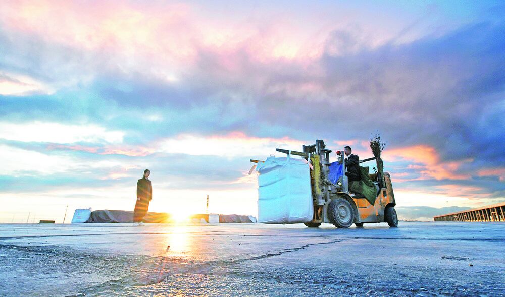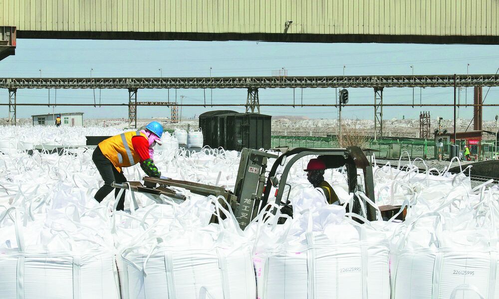 格爾木車務段察爾汗站湖區專用線貨物站臺上正在進行鉀肥裝車作業。