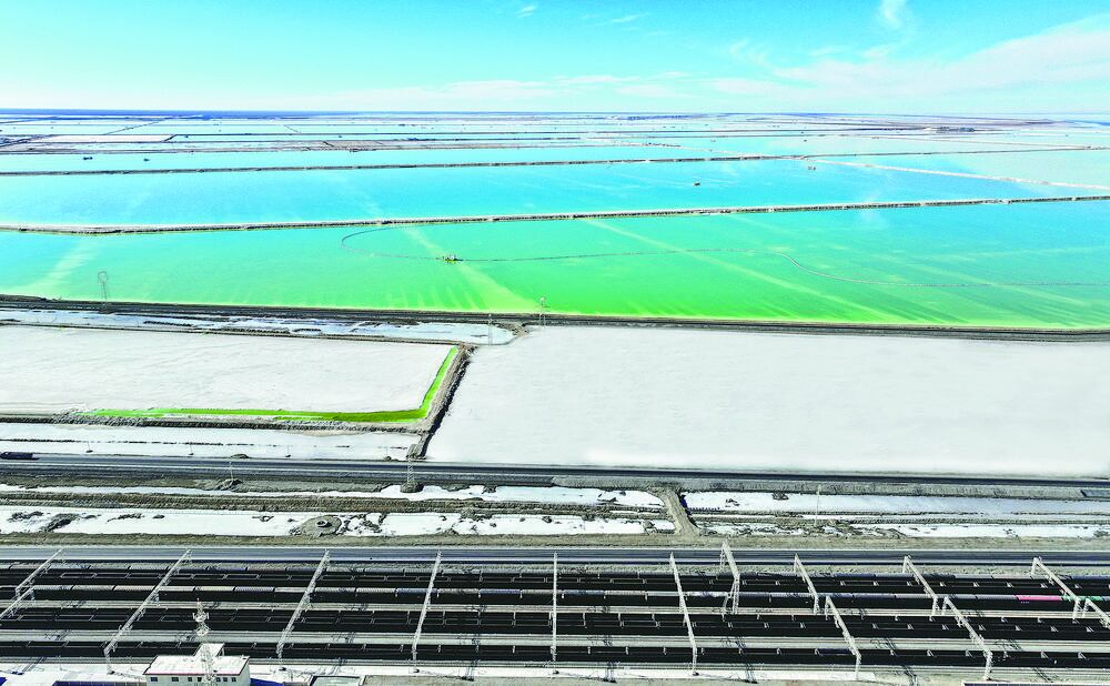 俯瞰格爾木車務段察爾汗站作業股道及鹽田。