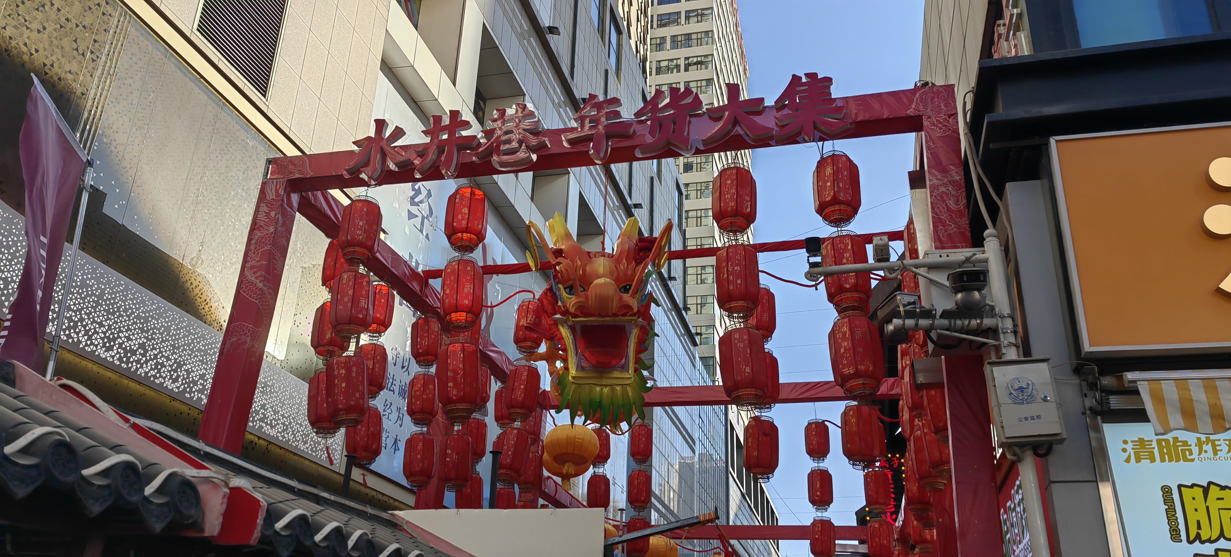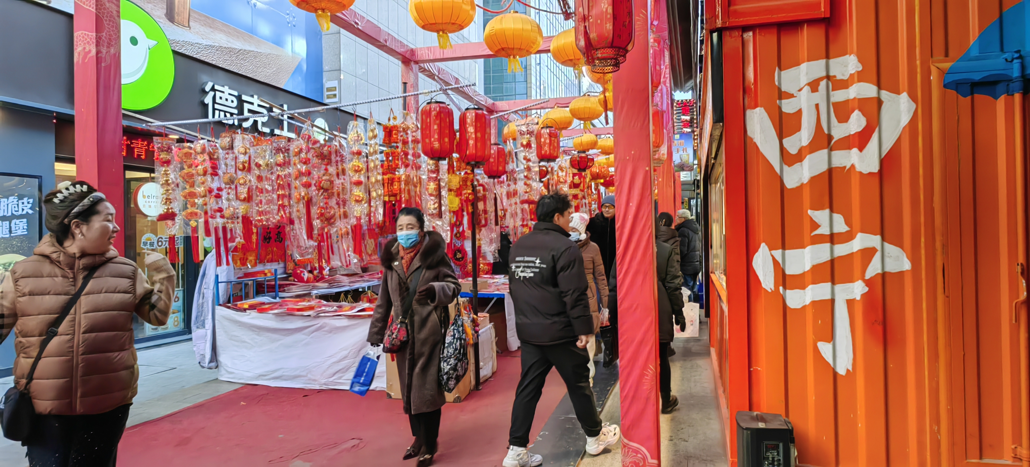 水井巷市場(chǎng)年貨節(jié)全長(zhǎng)約140米,整體氛圍營(yíng)造為水井巷市場(chǎng)東側(cè),于2024年1月5日開(kāi)始對(duì)市場(chǎng)進(jìn)行整體的氛圍布置工作,其中包含搭建龍門(mén)、吊掛燈籠、燈光亮化等工程。目前,市場(chǎng)內(nèi)增設(shè)年貨節(jié)攤位共83個(gè),有春聯(lián)、干果、糖果、禮盒、百貨、玩具等年貨產(chǎn)品。
