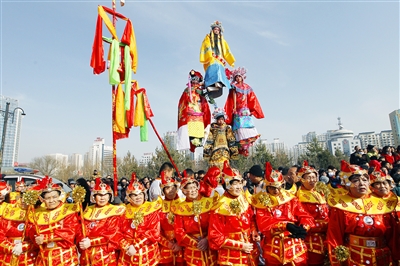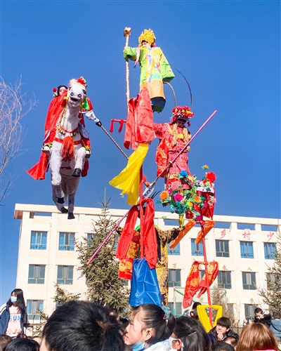 “高、懸、奇、妙”是千戶營高臺最大的特點。8歲左右的小演員們被裝扮成傳統戲劇或神話故事人物,綁扎于鐵木桿上,并固定于7米多高的平臺,由眾人抬著在街道巷子里巡游完成表演。