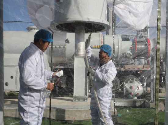 據了解,750千伏氣體絕緣金屬封閉開關設備(HGIS)安裝工作已接近尾聲,該設備組裝對環境潔凈度和溫濕度要求極高,為克服戈壁灘上肆虐風沙帶來的不利影響,750千伏氣體絕緣金屬封閉開關設備(HGIS)組裝現場搭建防塵棚并在外圍設置防沙隔板,“兩道防線”層層阻隔,施工人員全面檢測,現場粉塵顆粒度、溫濕度等指標合格后,擇機迅速開展設備對接等系列標準化作業。
