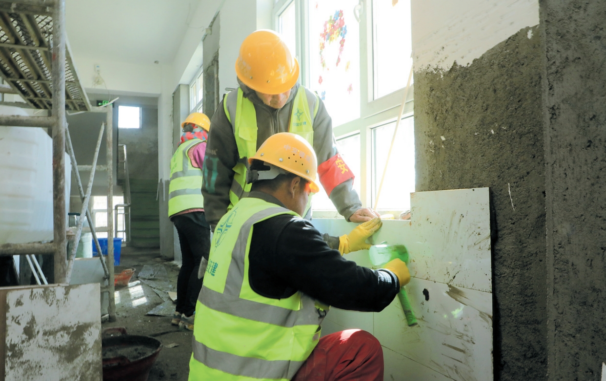 在民和縣滿坪鎮(zhèn)滿坪教學(xué)點和中川鄉(xiāng)清泉幼兒園災(zāi)后恢復(fù)重建項目施工現(xiàn)場,工人師傅正在加班加點,貼墻磚、抹墻灰,呈現(xiàn)出另一番繁忙景象。