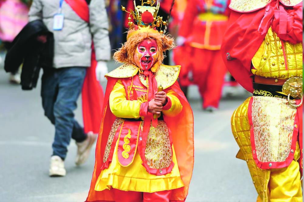這邊,身著彩衣的“八仙”,背著一束束用絹紙做成的花樹,吟誦著祈福國泰民安、五谷豐登、六畜興旺、村寨吉祥;高聳出人群的高蹺隊整齊劃一,和著鼓聲一步一探;身披斗篷、手拿金箍棒的小“美猴王”和頭戴翎子英氣十足的小“穆桂英”邁著瀟灑的步伐向前走去。那邊,大姑娘、小媳婦踏著喜慶的旋律,踩著歡快的鼓點,時而彩扇揮動,時而紅綢曼舞,把濃濃的年味傳到千家萬戶,展現(xiàn)出新時代的幸福生活。