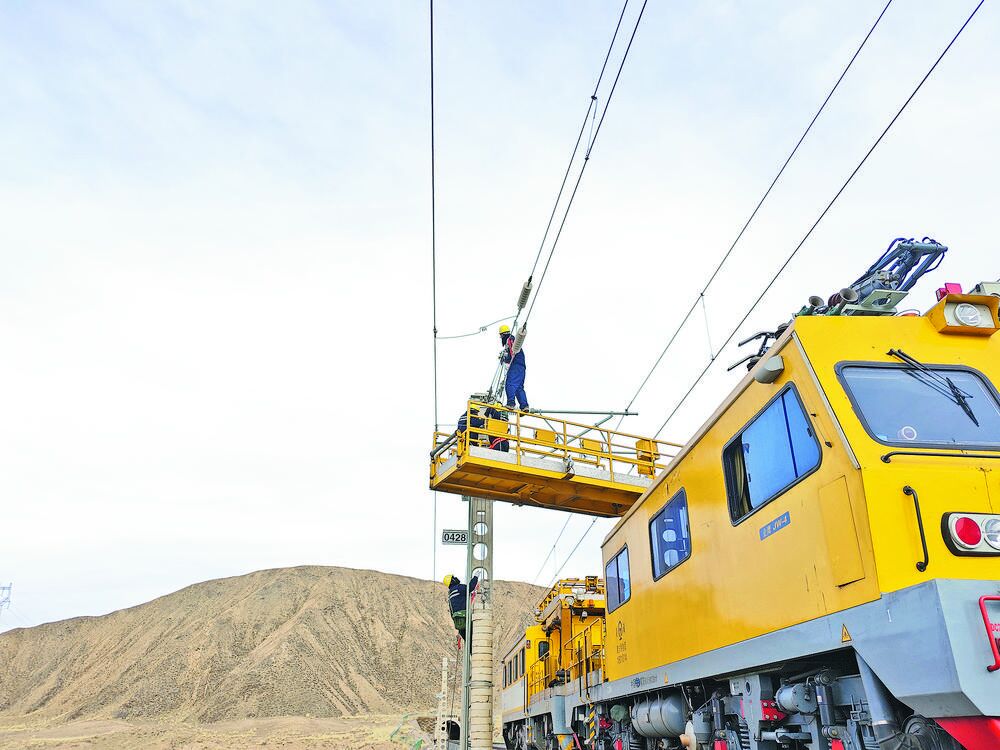 攀爬、檢查、摘掛、移動……檢修人員在近7米的高空中作業(yè),關(guān)角山下空曠的鐵道線上寒風(fēng)呼嘯,面對高空、寒冷作業(yè)風(fēng)險,他們沒有絲毫退縮,不斷地重復(fù)著一系列動作。