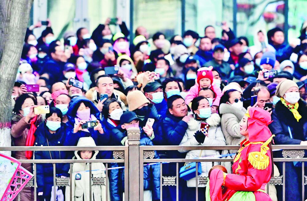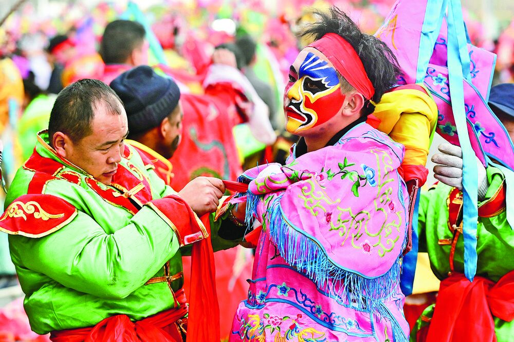 如果說年夜飯是一家人歡聚的大團圓,那鬧社火可以說是各族群眾共享的節日“盛宴”。“鑼鼓敲響,獅子扮上,燈官老爺登場了!社火開始啦!”一聲令下,舞長龍、耍獅子、騎毛驢、劃旱船、太平鼓、秧歌等表演依次登場,跟著整齊的鼓點,社火演員身姿輕盈、步調從容,臉上洋溢著喜悅之情。“社火是一種民俗表演形式,寓意祈求平安吉祥,祈禱國泰民安、風調雨順。”演出間隙,社火表演者孫先生對記者說,自己從小就喜歡看社火,今年第一次參加社火表演,心里非常激動。