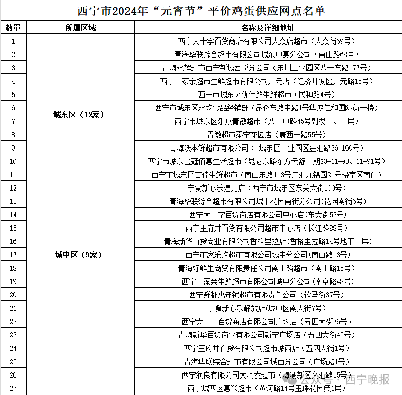 青海新聞網·大美青海客戶端訊 根據西寧市委市政府工作部署,為做好元宵節期間重要民生商品保供穩價工作,保障節日市場供應充足、價格穩定,西寧市定于2024年2月23日—24日共2天,在全市重點商超、平價蔬菜店開展蔬菜、雞蛋平價銷售。