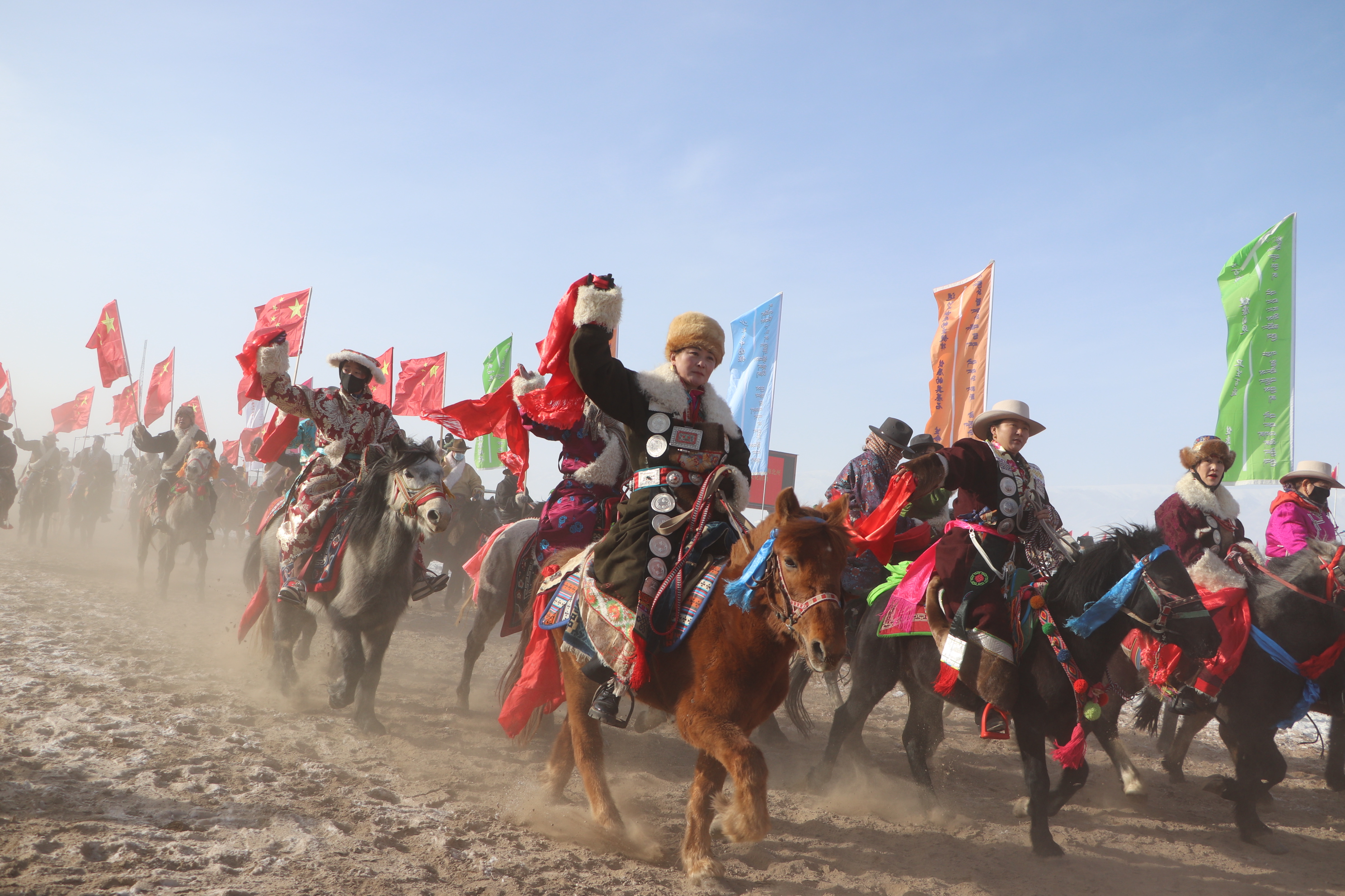 活動現場,海北州各族群眾身著艷麗的節日盛裝,神采飛揚、情緒高漲,舞龍舞獅、高蹺旱船、歡快的秧歌輪番登場,神圣的西王母、滑稽可愛的胖婆娘、八大光棍、八仙等傳統民間社火名角為元宵節增添了濃濃年味。素有“馬揚鞭之時確有御風飛行之妙”的金銀灘馬術隊,威風凜凜、英姿颯爽的公安騎警射箭隊,以馬為舞、以鞭為歌的歌舞團馬術表演隊,別出心裁、獨具特色的馬球表演隊,享有盛譽、名揚四海的“青海驄”馬駒方隊等騎藝表演給現場觀眾帶來別樣的視覺盛宴。