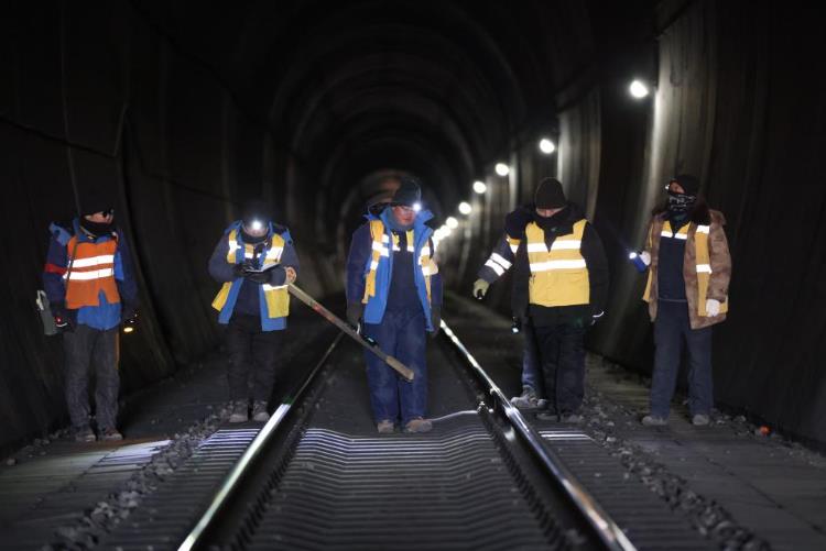 “路基變化、氣候波動……這些因素都是研究凍土影響的關鍵數據,一絲一毫的變化都會導致線路出現不同的問題。”工人們來到作業地點開始上道作業,張福強掏出一本快被翻爛的筆記本,一邊記下這次養護的氣候及線路數據,一邊和工友們向隧道深處走去。