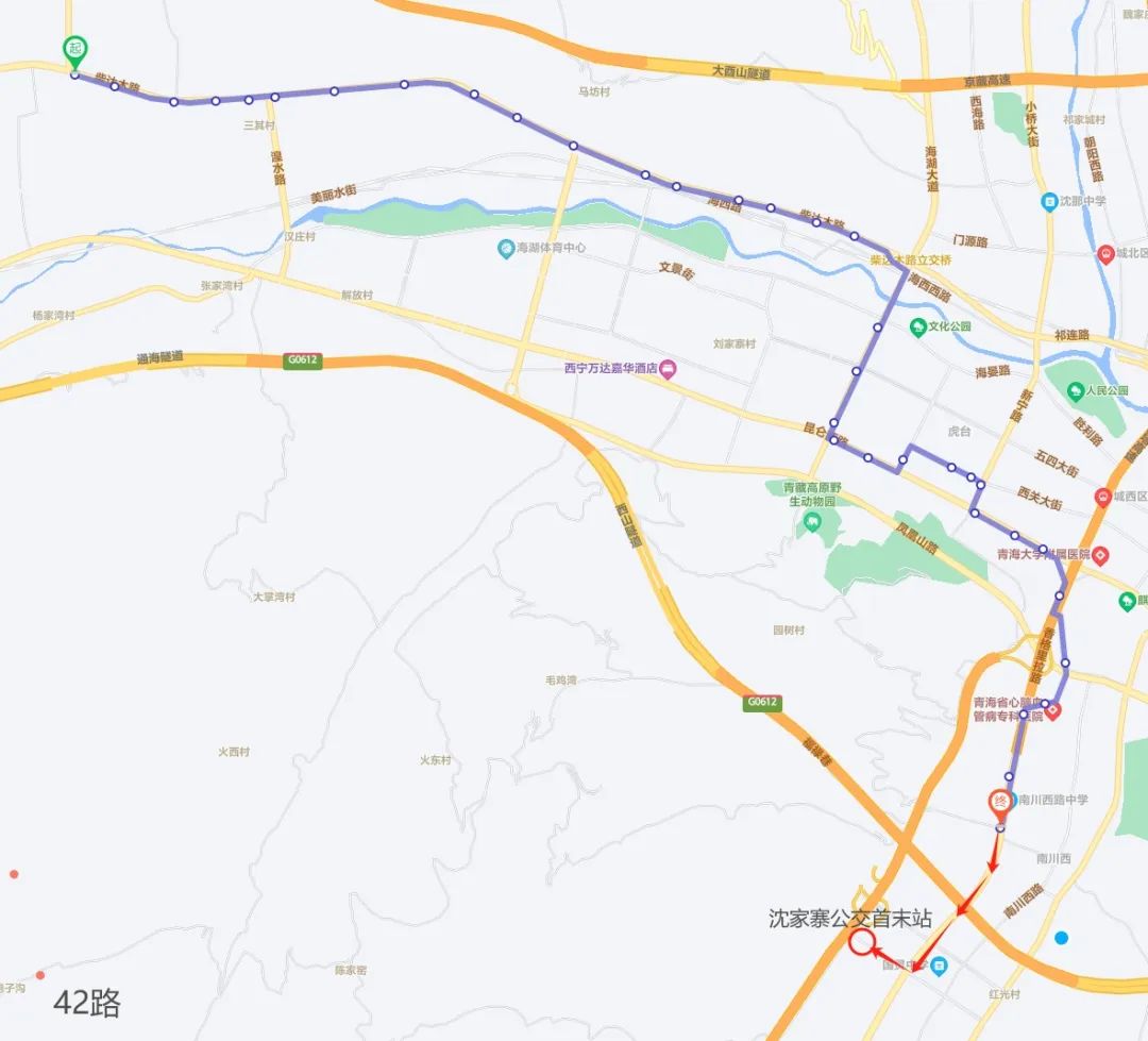 停靠站點:沈家寨公交首末站、沈家寨新村、市民中心西、春暉路口、香格里拉、園樹新村、磚廠路西口、心血管醫院、南川西路、市第二中學、香格里拉路北、西山一巷、市第十二中學、植物園、新寧路南口、虎臺、虎臺中學、青海廣播電視臺、冷湖路南、西川南路、殷家莊、海湖路南、海湖路中、海湖橋南、海湖橋、海湖橋西、鹽莊東、鹽莊、鹽莊西、馬坊東、萬科公園里、馬坊西、西杏園、杏園村、杏園西、三其東、三其、三其西、三其村、轉運站、農副產品集散中心、3419工廠。運營時間不變。