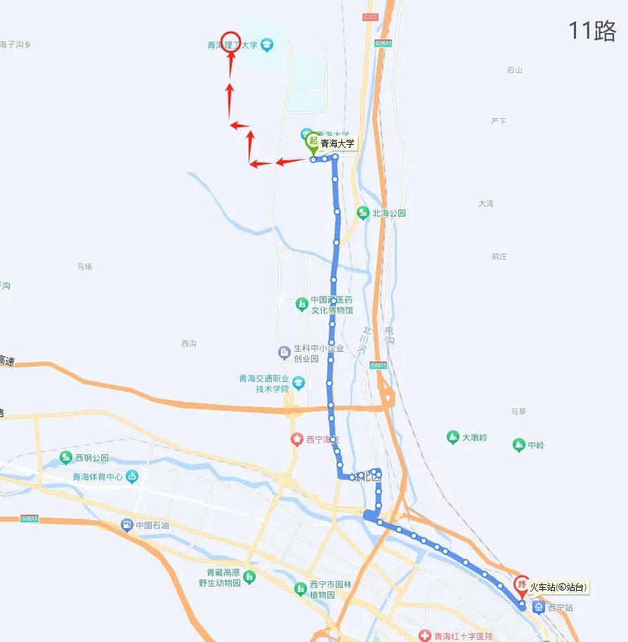 線路走向:青海理工大學、崇德路、永年街、清源路、海湖大道、金羚大街、寧張路。