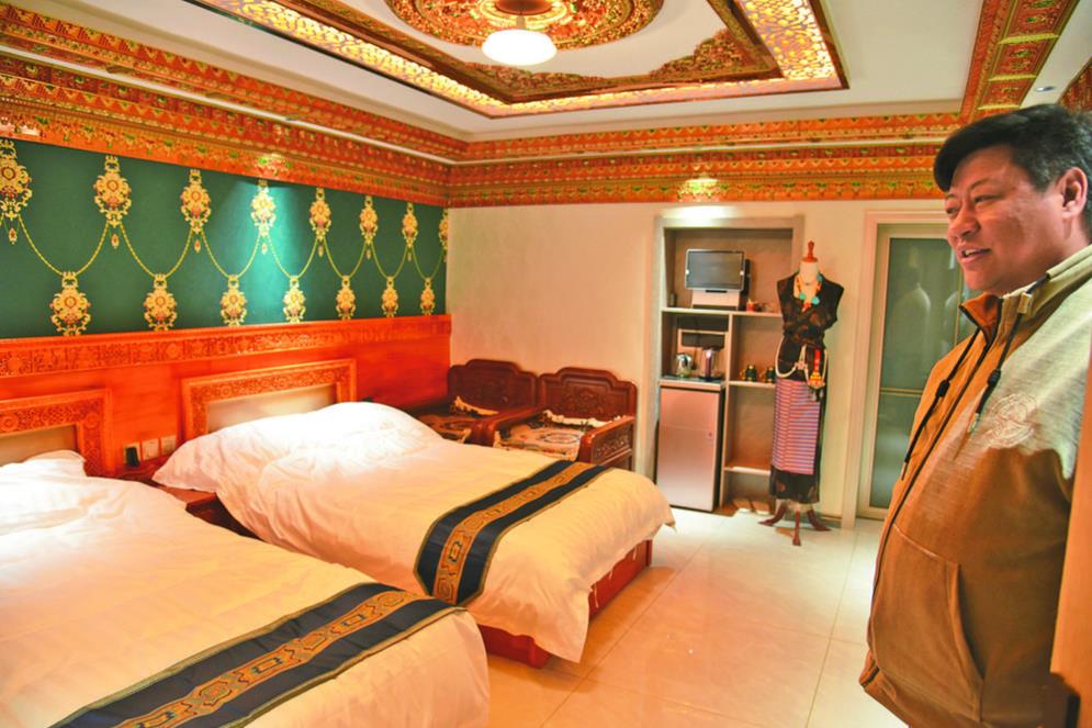 在鬧布桑周的邀請下,記者沿著村子西頭的道路走進他家的民宿——“贊布莊園”,映入眼簾的是一張鑲刻在大堂墻面上布達拉宮的精致照片,從前臺到大廳,傳統(tǒng)的藏式織錦、美觀大氣的雕花圖案、藏式風(fēng)格的吊頂和華麗裝修,讓這里處處散發(fā)著藏民族別具一格風(fēng)情和魅力。