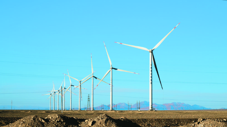 碧藍天空下,潔白的風力發電機高高聳立。陳陽/攝