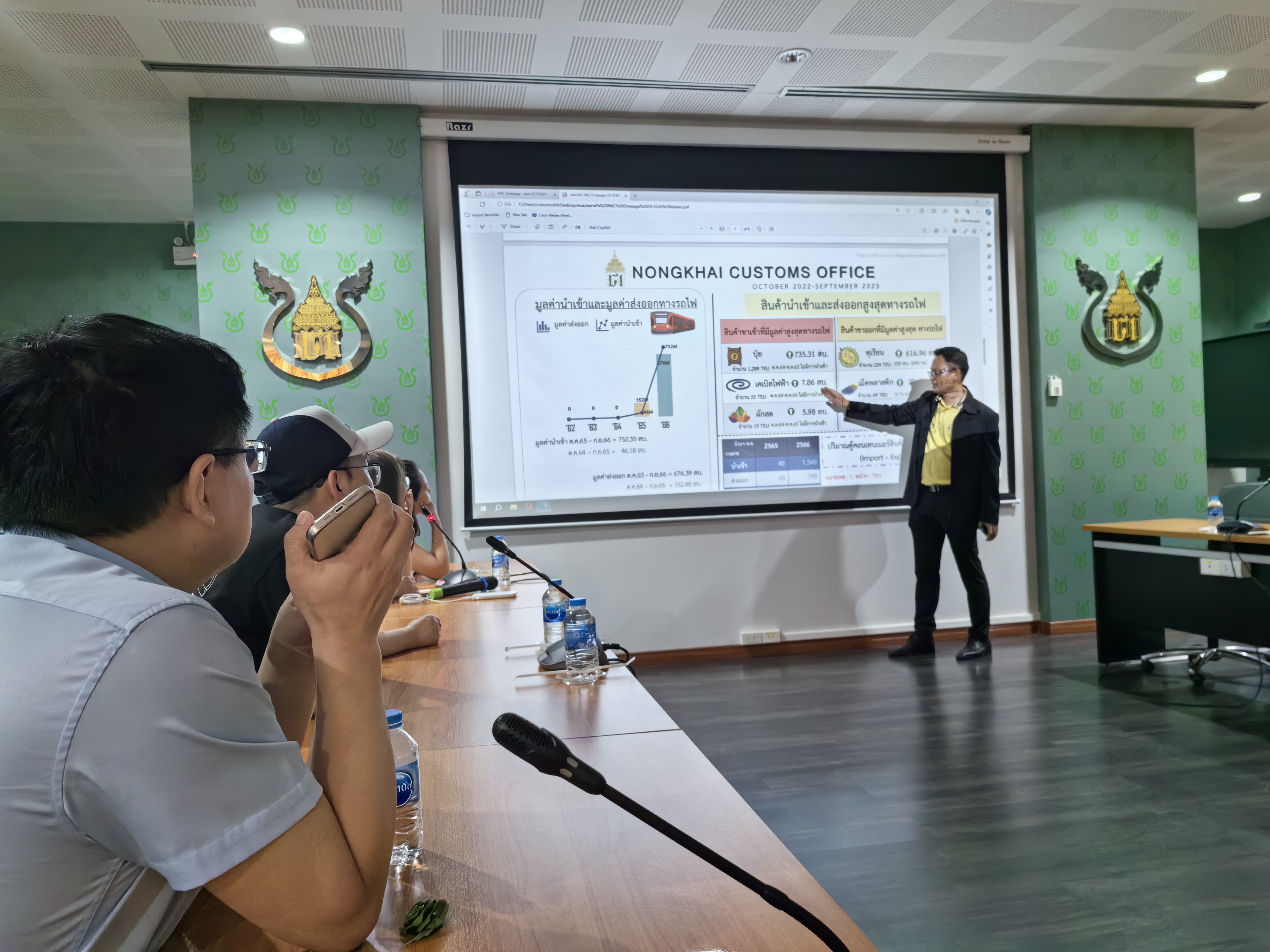 隨后,媒體團一行前往廊開海關采訪,海關總監介紹了近幾年在搶抓中老鐵路開通機遇、實現進出口貿易快速增長方面的相關情況,表示已為中泰高鐵二期工程建成后,發展物流系統、推動一站式服務方面做了相關準備。