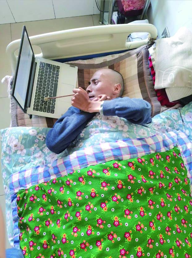 青海新聞網(wǎng)·大美青海客戶端訊 平躺在1.2米寬的床上,頭轉(zhuǎn)向左側(cè),專注地盯著筆記本電腦屏幕。走進位于西寧市湟中區(qū)共和鎮(zhèn)河灣村的都海成家里時,他盡力把左臂伸向右側(cè),拿著一根長筷子艱難地在鍵盤上敲出一個個漢字。