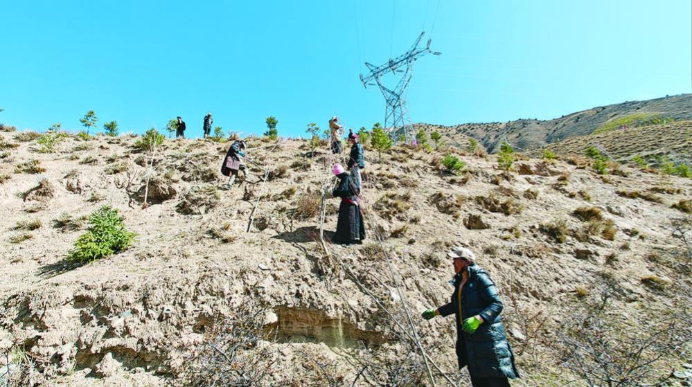 在稱多縣歇武鎮(zhèn)直門達(dá)村植樹點,來自玉樹市各行各業(yè)的干部群眾帶著樹苗、扛著鐵鍬,在事先規(guī)劃好的植樹點上認(rèn)真栽植,再細(xì)心地澆上水。大家期待著,來年時這些他們親手栽下的樹苗,能夠像遠(yuǎn)處山坡上已經(jīng)透著綠意的樹木一樣,為玉樹的春天再添生機。
