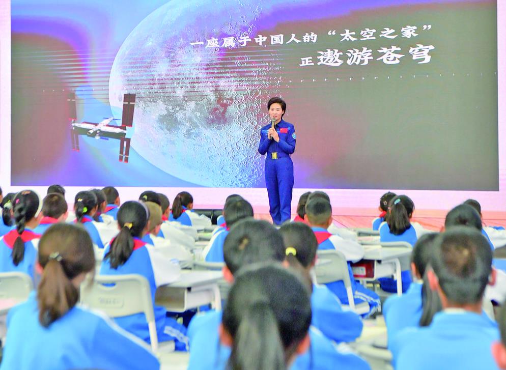 面對臺下一雙雙充滿好奇的清澈眼睛,劉洋從自己孩提時代萌生的第一個夢想開始,向孩子們講述她如何一步步成為航天員,最后實現遨游太空的夢想,并與孩子們分享了從太空拍下的美麗的地球家園。臨近“下課”時,她身后的電子屏幕上分別用紅色和黑色的字體赫然寫下“信念不滅,高歌向蒼穹。”