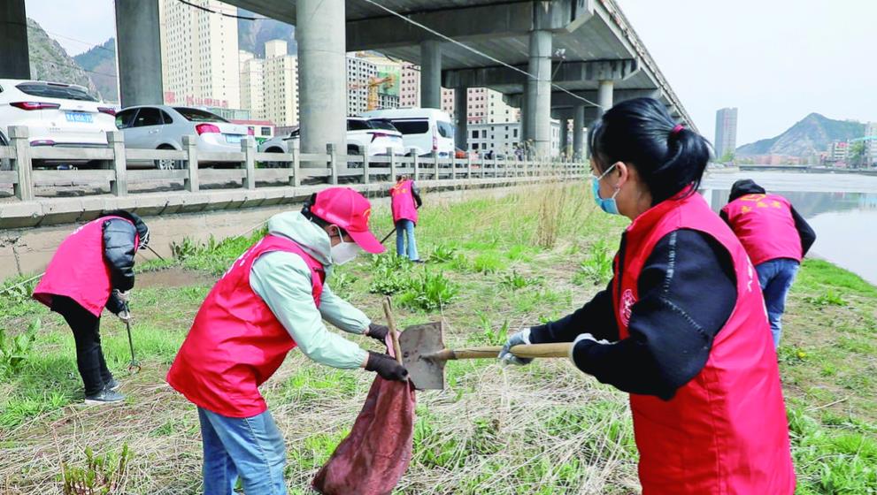 在昂保忙著河道巡視的時間里,流經西寧市大通回族土族自治縣境內的黃河二級支流北川河邊也逐漸熱鬧起來,北川河橋頭鎮園南社區段河長白艷花和志愿者穿上紅馬甲,帶上清理工具開始一天的巡河工作。為了讓更多人參與河道治理,白艷花邊清理垃圾邊與來往的老百姓聊天普法。“住在這里的老居民都記得河道過去就像個垃圾場。”白艷花回憶起從前無奈地搖了搖頭。