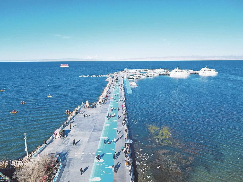 5月1日,青海湖二郎劍景區碼頭熱鬧非凡。在這里,成群的水鳥翩翩起舞,它們時而低頭在水面覓食,時而展翅低飛,劃過碧波蕩漾的湖面,為春日的青海湖注入勃勃生機。