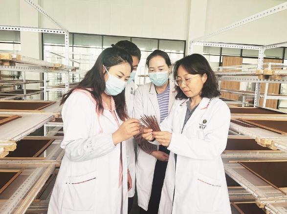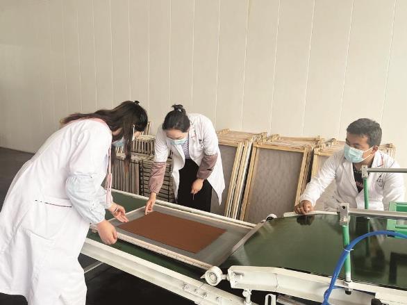 吾卻卓瑪(右一)和制香工人查看晾曬后的藏香。