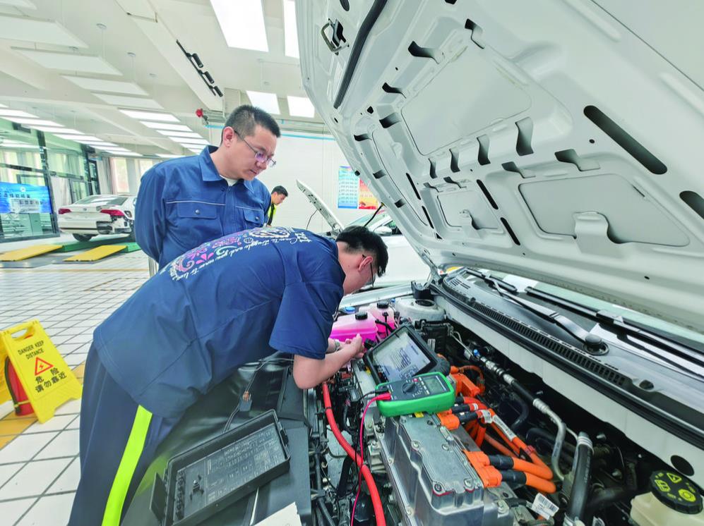 新能源汽車運用與維修專業學生進行冷卻系統故障排除。