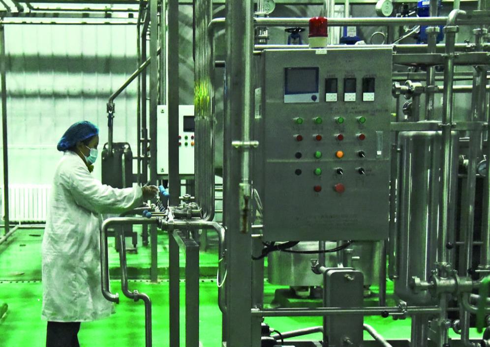 跟隨索巴,走上公司二樓平臺,2000平方米的現代化奶制品加工車間一覽無遺,十幾名工人各司其職,一派忙碌景象。