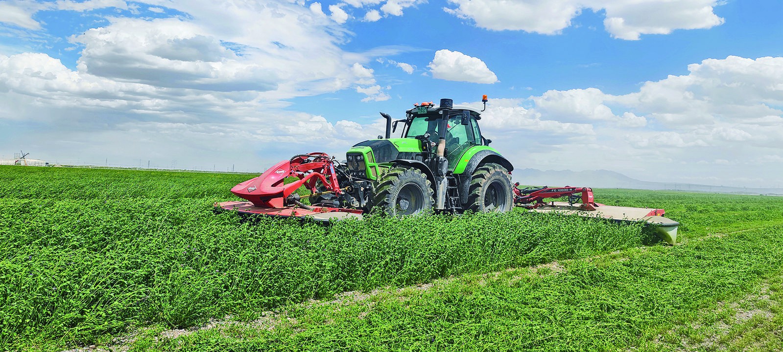 6月25日,在位于海西蒙古族藏族自治州德令哈市尕海鎮(zhèn)陶哈村的青海奔盛草業(yè)有限公司萬(wàn)畝飼草種植基地,十多臺(tái)收割機(jī)來(lái)回穿梭,四百多公頃的苜蓿迎來(lái)豐收季。據(jù)悉,為有效提高鹽堿地利用水平,德令哈市通過(guò)科學(xué)改良土壤、推進(jìn)適土適種、引進(jìn)優(yōu)質(zhì)品種等措施,在鹽堿地上打造萬(wàn)畝高標(biāo)準(zhǔn)飼草種植基地,種植青貯玉米、苜蓿、燕麥等飼草作物,積極打造“草畜一體化”全產(chǎn)業(yè)鏈,不斷塑造綠色有機(jī)農(nóng)畜產(chǎn)品輸出地新優(yōu)勢(shì)。記者 丁玉梅 攝