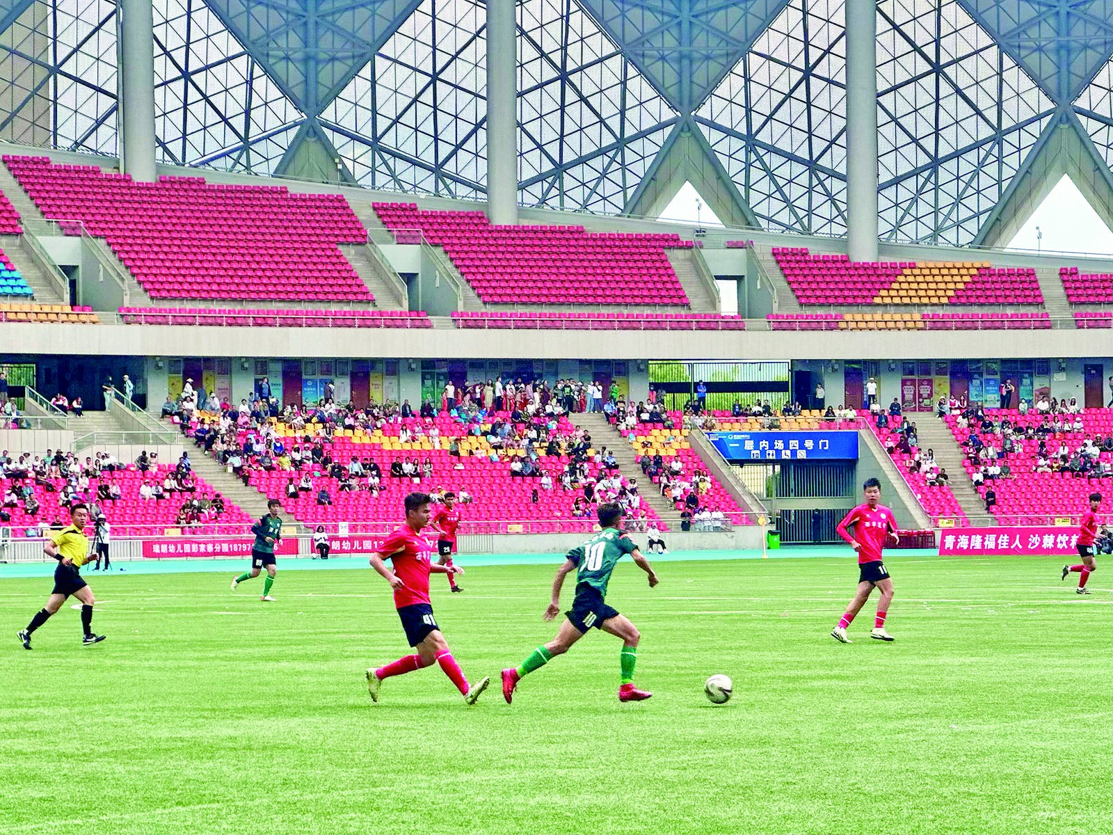 比賽開始,隨著裁判員一聲清脆的哨響,球員迅速進入狀態。身著西寧夏都隊紅色上衣的隊員配合默契,攻防兼具,不時直逼對方球門。海東青海拉面隊的球員也不甘示弱,流暢過人,遠距離射門出其不意,對抗感十足,賽場瞬息多變的形勢牽動著在場觀眾的心,聲浪伴著足球一起飛翔。