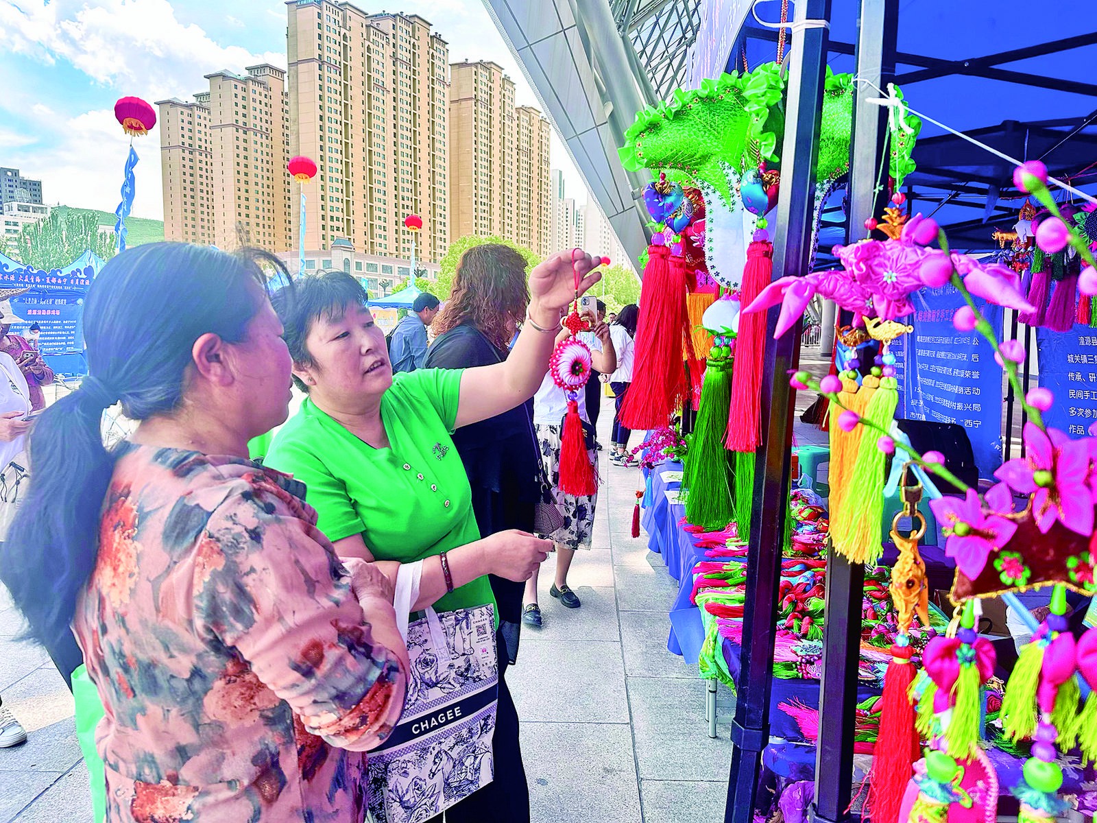 群眾駐足觀賞多彩香包。記者 王晶 攝