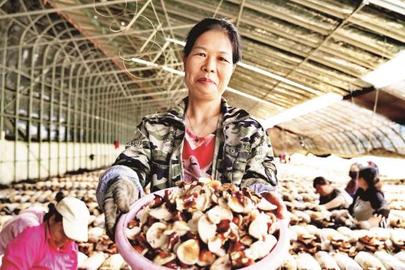西崗村靈芝種植基地,務工人員展示采摘的新鮮靈芝。