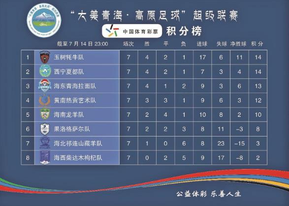 目前,玉樹牦牛隊(duì)和西寧夏都隊(duì)同是4勝2平1負(fù),積14分,但玉樹牦牛隊(duì)以凈勝球優(yōu)勢位列第一,海東拉面隊(duì)、黃南熱貢藝術(shù)隊(duì)、海南龍羊隊(duì)、果洛格薩爾隊(duì)、海北祁連山藏羊隊(duì)、海西柴達(dá)木枸杞隊(duì)分列第三位至第八位。