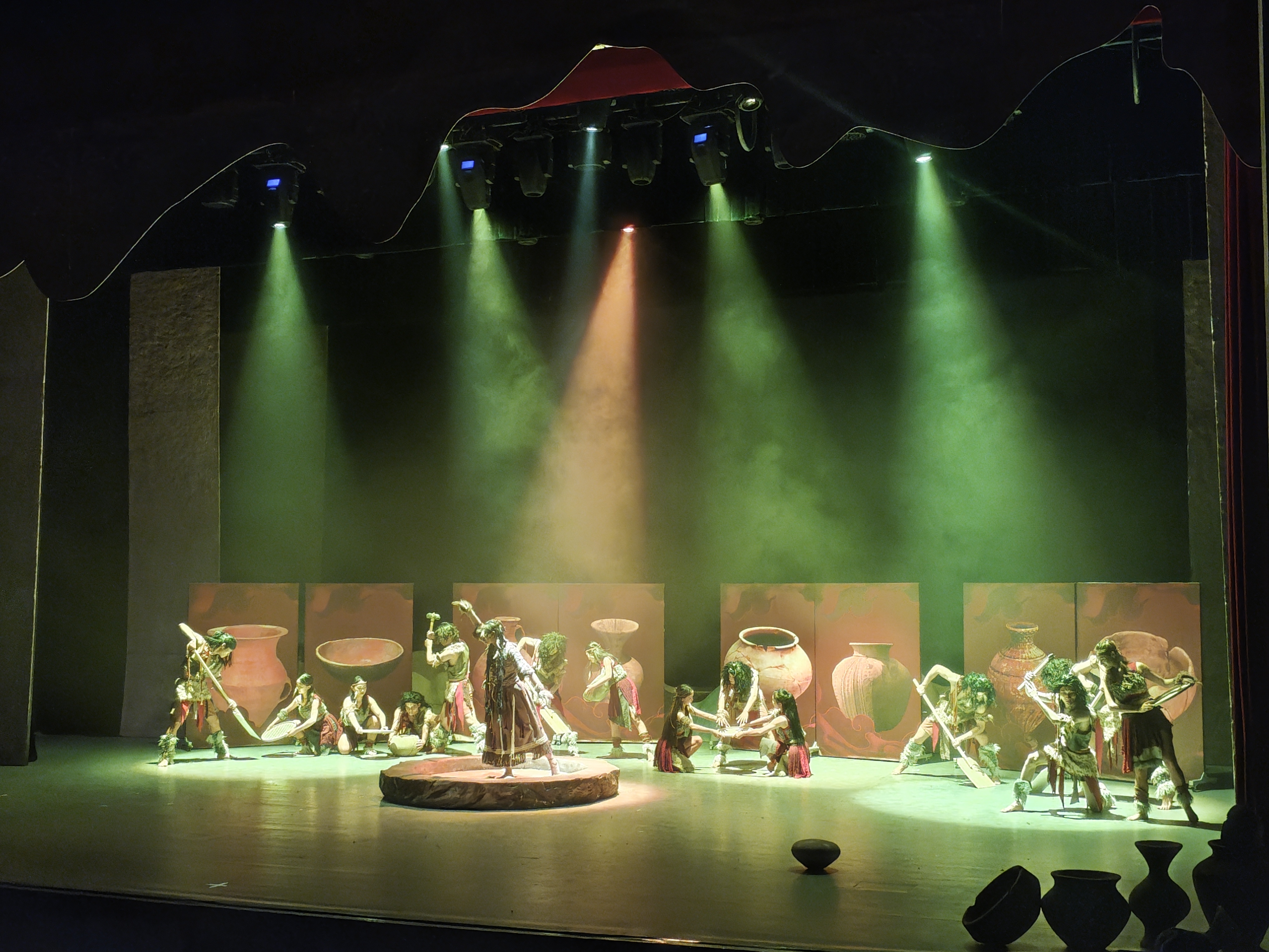 舞蹈詩“活態”還原和再現先民們的生活景象。以彩陶作為情感敘事載體和主題性脈絡進行音樂舞蹈詩的創編和舞蹈動作的設計,以“五人舞蹈紋彩陶盆”舞蹈動作為基礎,以當代舞蹈語言和現代聲光電技術作為藝術表現基礎,結合河湟地方文化特征進行雜糅和拓展,體現新時代西寧文藝的創新實踐,以舞臺展演的形式完成作品的呈現。