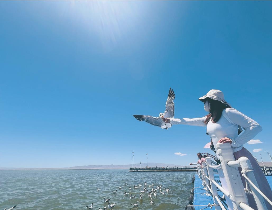 湖水清澈透明,湖底水草如畫,湖畔蘆葦高密。這里是美麗的可魯克湖,位于海西蒙古族藏族自治州德令哈市。7月28日,在可魯克湖旅游景區內,記者看到游客們或乘坐觀光船觀賞湖上美麗風光,或行走在湖畔,與一群紅嘴鷗進行親密互動。隨著生態保護工作的不斷加強,可魯克湖的鳥類種類和數量也在逐年增加。這些鳥兒在湖面上翱翔、覓食、嬉戲,構成了一幅幅生動的生態畫卷,吸引著眾多游客前來觀光旅游,感受大自然的神奇魅力。
