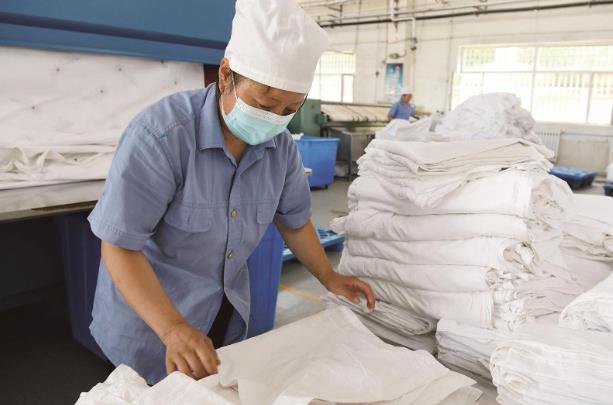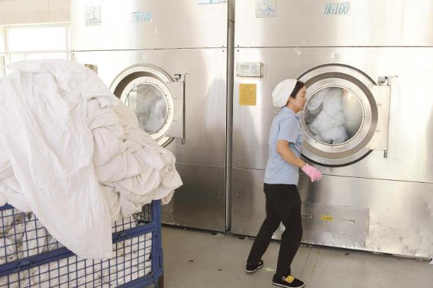 “我們洗滌廠內,有7臺大型洗衣機,1臺小型洗衣機,7臺燙平機。1臺大型洗衣機能洗床單1000條左右,可以洗被套320條左右,也可以洗枕套2000件左右。”冀小琴介紹。