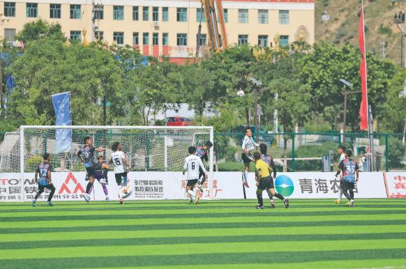 上半場比賽臨近結束時,黃南熱貢藝術隊隊員展現出了出色的射門技術,他們密切配合、團結協作,抓住對方防守漏洞,一腳勁射,皮球直掛球門死角,暫時以2比1的成績領先玉樹牦牛隊。