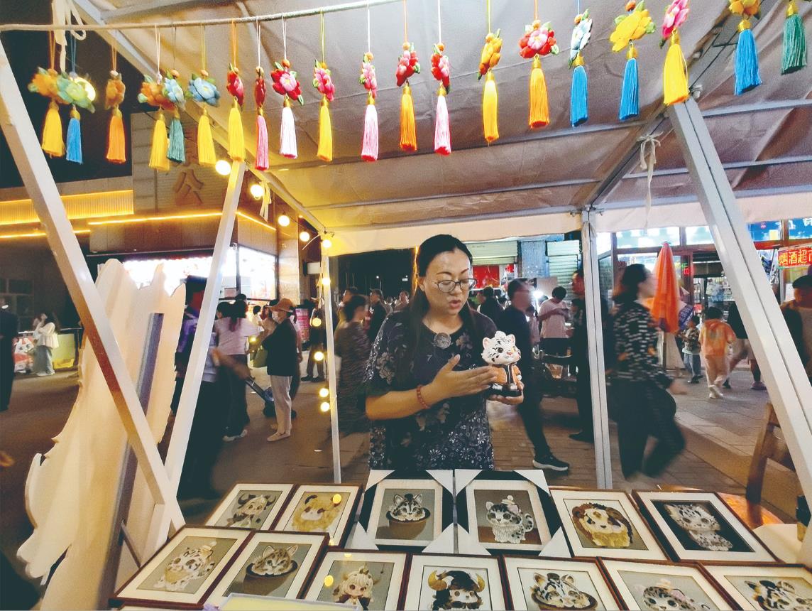 布偶、香包、剪紙、公仔……這里有各種形態(tài)的雪豹,可把玩、可觀賞、也可帶走。周勤慧說:“自豹街開街設(shè)置非遺展區(qū),我們公司推出了雪豹系列、牦牛系列、藏羚羊系列等數(shù)百種文創(chuàng)產(chǎn)品,用掐絲等手工藝將本地特色元素融入其中,深受游客喜愛。”