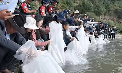 當日,農業農村部長江流域漁政監督管理辦公室組織青海、四川兩省農業農村廳,在果洛州班瑪縣瑪可河(長江水系一級支流大渡河正源)聯合開展川陜哲羅鮭等珍稀瀕危物種增殖放流活動。現場放流國家一級重點保護野生動物川陜哲羅鮭后備親魚24尾,同時放流重口裂腹魚、齊口裂腹魚等珍稀水生生物10萬尾。
