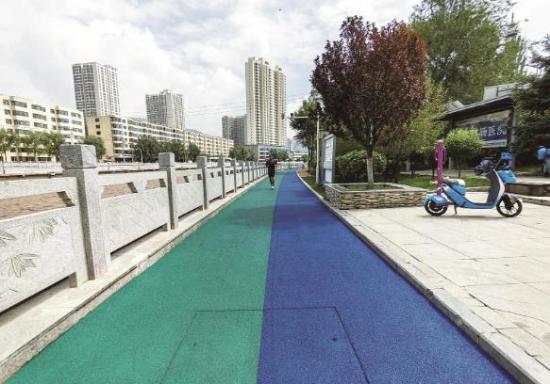 9月3日上午,記者在魯青公園湟水河城西段靠近人民公園處的綠道段上看到,一部分藍(lán)綠相間的嶄新智能健身步道上,慢跑、快走、騎自行車的市民絡(luò)繹不絕。
