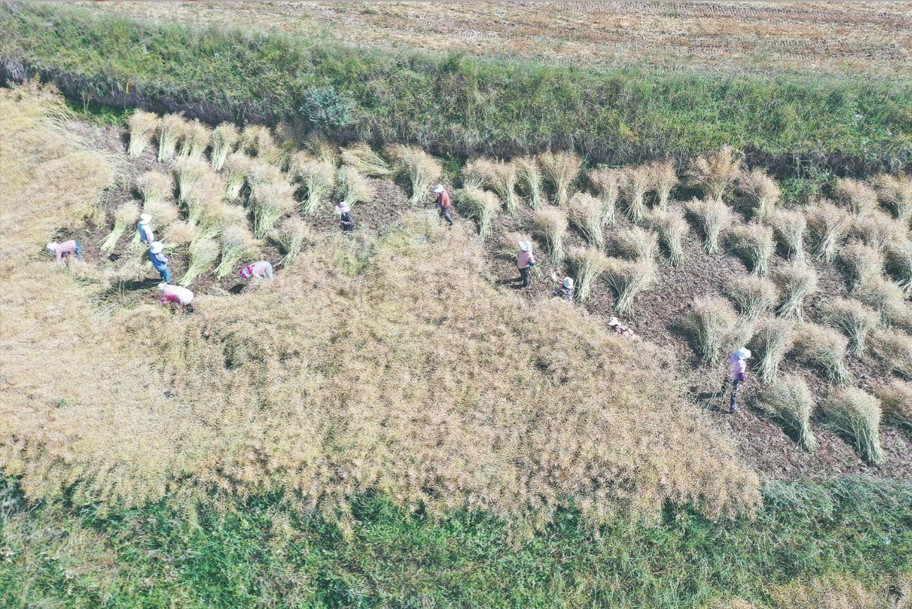 9月10日,走進平安區制種基地,金黃色的油菜花在田地里蕩漾,收割機咆哮著進入油菜田,刀片在旋轉中發出尖銳的呼嘯聲,一片片油菜花輕輕被切割,從根部分離,工人們手握鐮刀,在田間穿行,對收割機做著補充。
